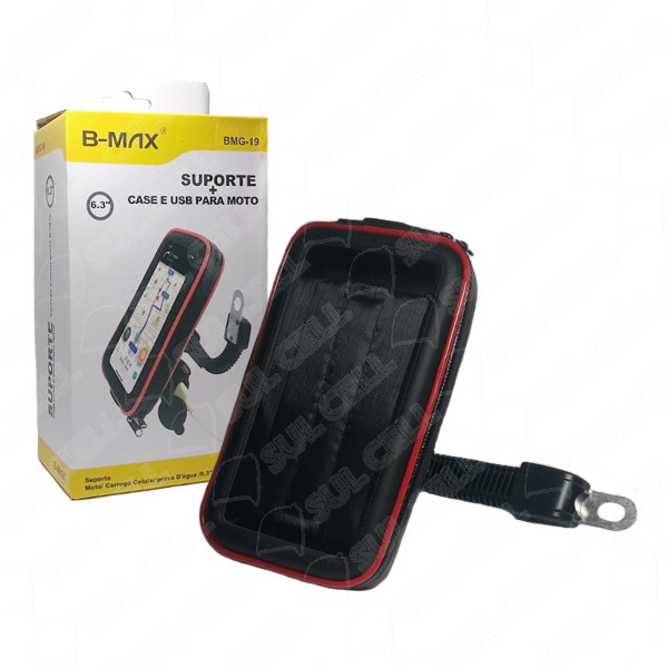 Suporte case permeável de moto para smartphone com carregador USB p/ até 6.3 polegadas.