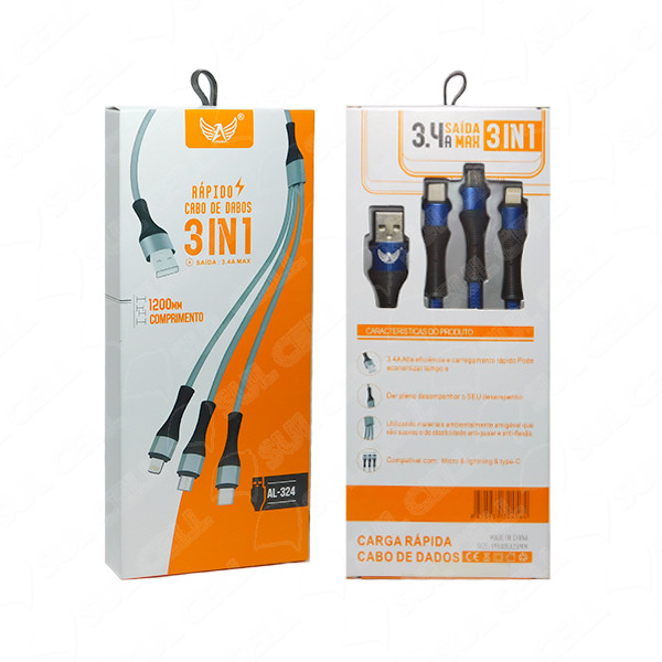 Cabo de Dados e Carga 3 x 1 v8 Tipo C Iphone 3.4A (AL-324) - 1.2m