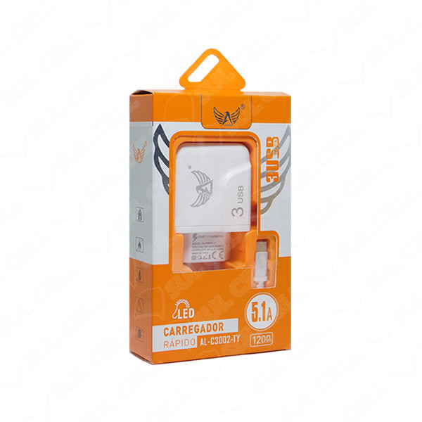 Carregador Fonte de Tomada Rapido Tipo C 5v 5.1A Usb Triplo (AL-C3002-TY) -1.20m