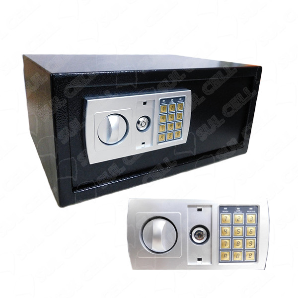 - Material: A construção do cofre é sólida em Aço carbono e o painel digital é de plástico resistente