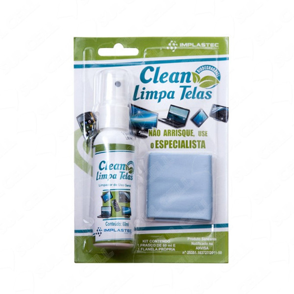 - Limpa Telas Implastec Clean biodegradável desenvolvido para a remoçao de manchas, marcas de dedos (gordura) e poeira de monitores de LED, LCD e Plasma.